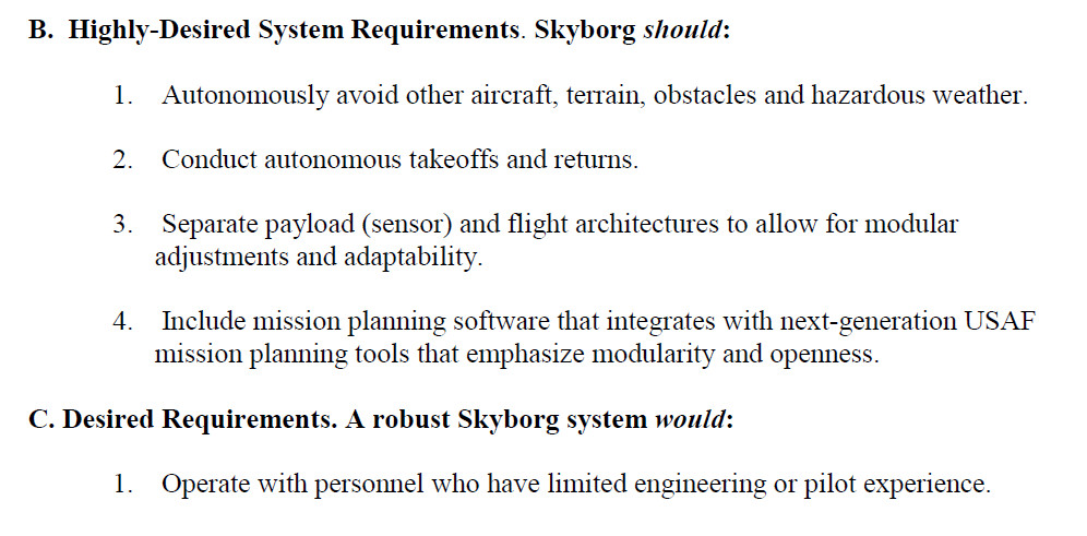 If the drone could already have a terrain avoidance and all-weather flight capability, be able to take off and land on autonomously, and feature modular payload bays for sensors and other systems, the Air Force Research Laboratory says this is “highly-desired,” though not essential, at least at the beginning. Lastly, the Air Force says it is “desired” that the Skyborg systems and associated aircraft be still be easy to use even for personnel who have limited or no engineering or pilot background if at all possible.