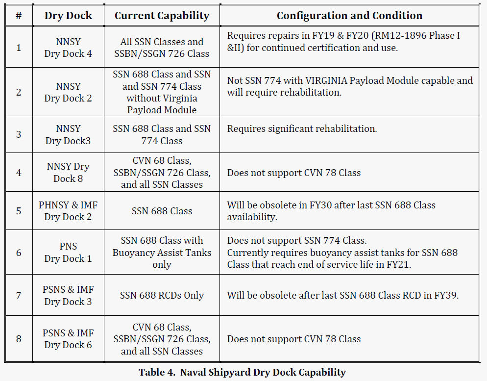 This doesn’t take into account the increasing difficulties the Navy is having in maintaining the ships and submarines it already has at the funding levels it has now. The day after it made the long-range shipbuilding plan publicly available, the service released its first ever long-range maintenance and modernization report, which highlight many of these ongoing issues, particularly the lack of dry dock capacity, both organically and immediately available in the private sector.