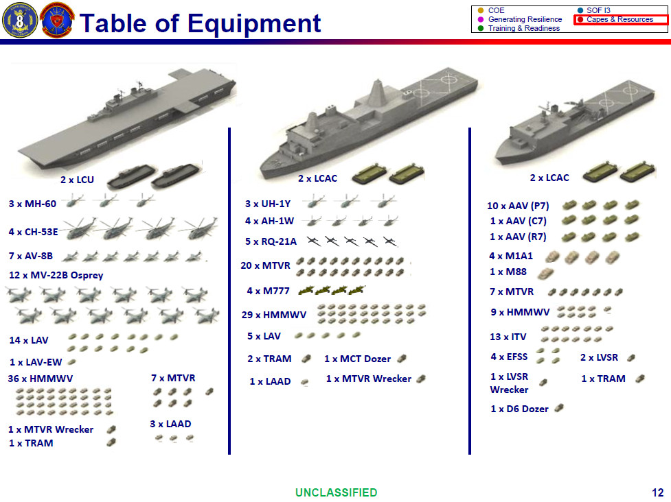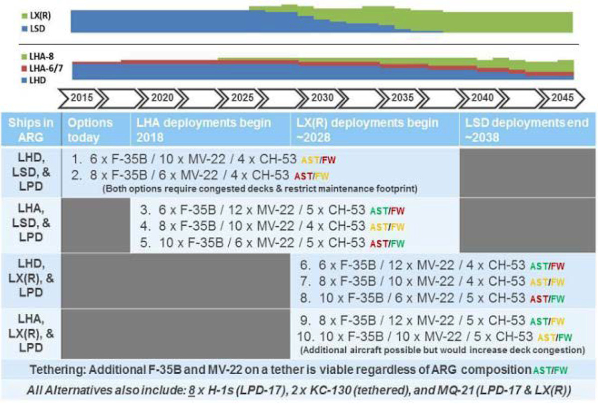 In the past, the Marines have outlined two basic ACE configurations for embarked Marine Expeditionary Units (MEU) on Amphibious Ready Groups (ARG) consisting of one Wasp-class amphibious assault ship, one San Antonio-class landing platform dock, and one Whidbey Island-class landing ship dock. One of these has six F-35Bs, 12 MV-22s, and four CH-53Es, while the other has eight F-35Bs, six MV-22s, and four CH-53Es.