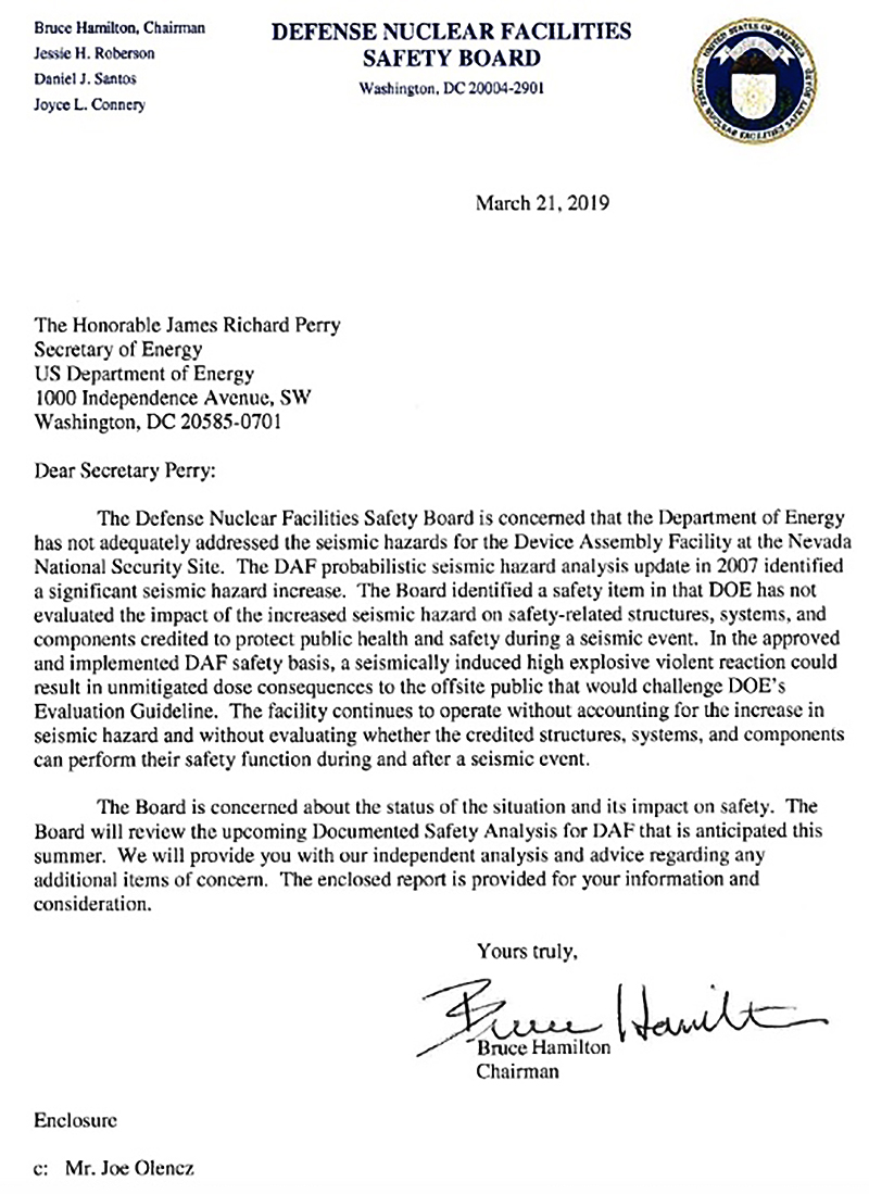 “The Defense Nuclear Facilities Safety Board is concerned that the Department of Energy has not adequately addressed the seismic hazards for the Device Assembly Facility at the Nevada Nationatinal Security Site. The DAF probabilistic seismic hazard analysis update in 2007 identified a significant seismic hazard increase… A seismically induced high explosive violent reaction could result in unmitigated dose consequences to the offsite public… The facility continues to operate without accounting for the increase in seismic hazard and without evaluating whether the credited structures, systems, and components can perform their safety function during and after a seismic event.”