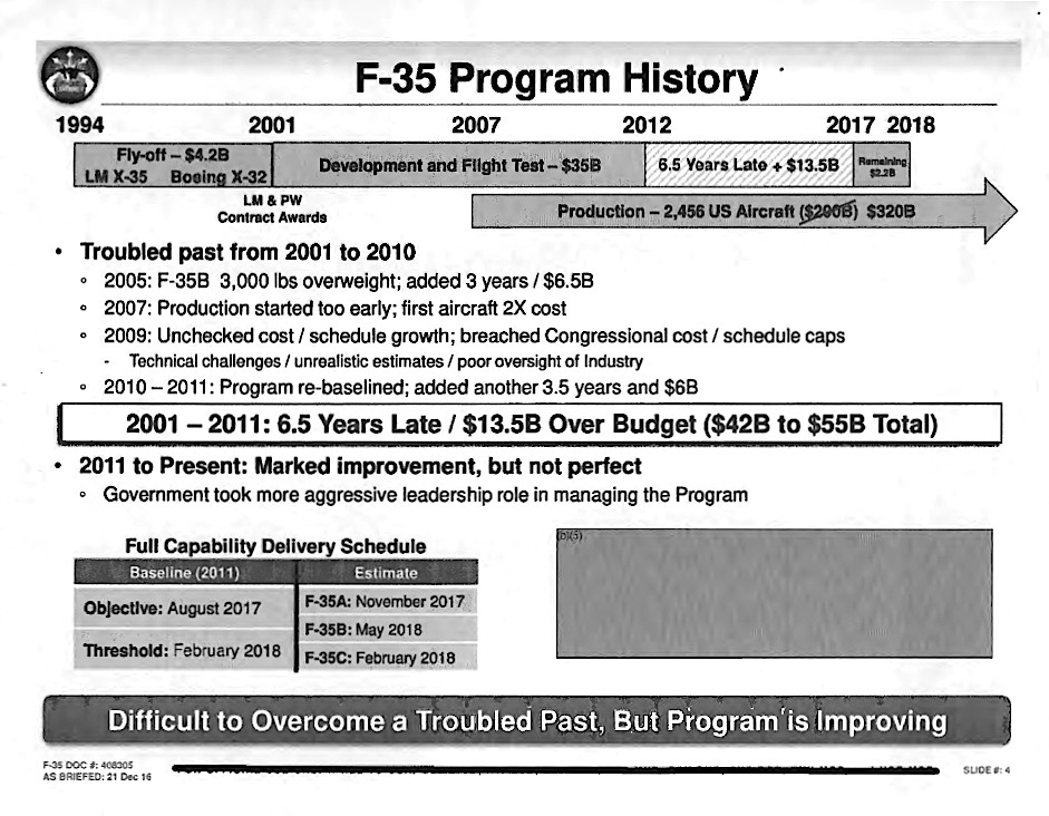 But the third slide, covering the program’s history, efficiently uses space to catalog a host of serious missteps and mistakes in its execution up to that point. It mentions the delay over the F-35B weight issues, the solution to which may have subsequently caused additional problems, and that the decision to begin serial production in 2007 was premature. The entry for 2009 shows that basically everything that could go wrong for the program, did go wrong.