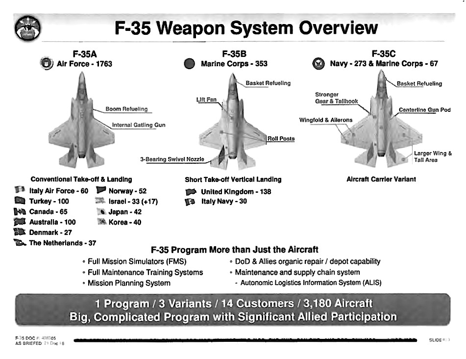 To his credit, Lieutenant General Bogdan’s presentation is one of the most candid official assessments of the F-35 program to ever become public. The briefing starts out with two slides highlighting well-established talking points about the F-35’s feature set, especially its electronic warfare and sensor fusion capabilities, and a note about the array of allies involved in the program.