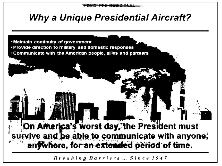 That was the environment General Everhart was walking into to make his own briefing about the Air Force One replacement program. The officer got straight to the point of how critical it is to have these presidential planes and why they invariably cost so much. The very first two slides focus entirely on how President George W. Bush rode on one of the existing VC-25A planes in the immediate wake of the 9/11 terrorist attacks.