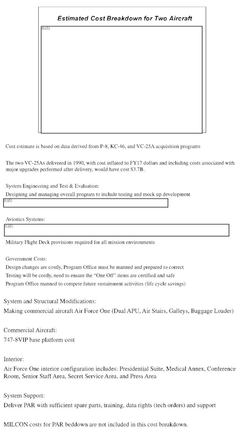 The slide on the program’s cost estimates, which remain the subject of significant controversy, is redacted entirely, though many of the talking points remain. Curiously, the Air Force appeared to argue that what it was doing at the time was in line with the acquisition of the two VC-25A aircraft in the 1980s and the sustainment and upgrading of those aircraft afterward. The VC-25As, “including costs associated with major upgrades performed after delivery,” would have cost $3.7 billion in Fiscal Year 2017 dollars, according to the briefing.