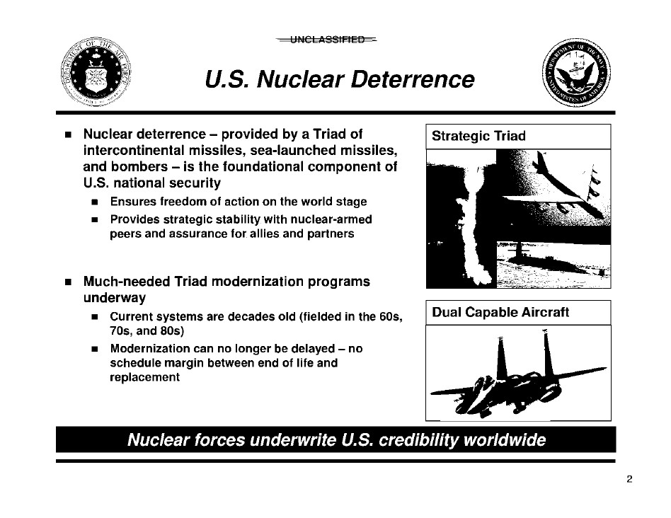 On Dec. 21, 2016, Trump met with multiple flag officers from the U.S. Air Force and the U.S. Navy. The War Zone obtained a total of three unclassified briefings and one set of unclassified talking points through FOIA. U.S. Air Force Lieutenant General Chris Bogdan, then head of the F-35 Joint Program Office, briefed the President-Elect on the stealthy fighter jet and U.S. Air Force General Carlton Everhart, chief of Air Mobility Command, provided an overview of the Air Force One recapitalization program. U.S. Air Force Lieutenant General Jack Weinstein, Deputy Chief of Staff for Strategic Deterrence and Nuclear Integration, and U.S. Navy Vice Admiral David Johnson, the principal military deputy for the Assistant Secretary of the Navy Research, Development and Acquisition, jointly briefed Trump on the Nuclear Triad. U.S. Air Force Vice Chief of Staff General Stephen Wilson prepared talking points for the meeting. Bogdan, Everhart, Johnson, and Weinstein have all since retired.