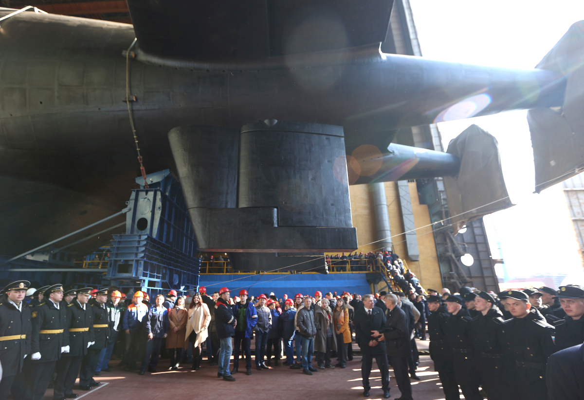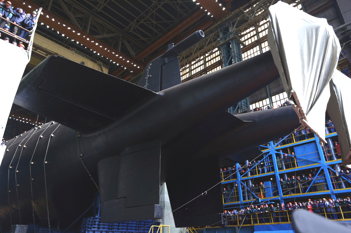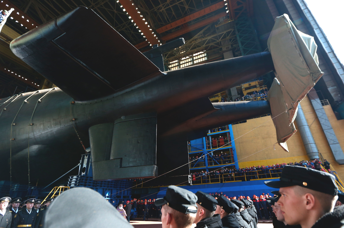 Pictures from the ceremony at Sevmash only show the rear of the submarine. Experts have noted that some features, such as the tube to hold a towed sonar array at the top of the upper rudder, are carry-overs from the Oscar II-class.