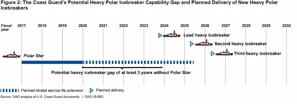 At that time, the Coast Guard and the Navy said the expected the first new heavy icebreaker to get delivered in 2023, a year earlier than the current plan. The Coast Guard is already looking at another potentially costly life extension program for the Polar Star to avoid a gap starting in 2020 in which the U.S government would own no heavy icebreakers whatsoever. The Navy says that there are monetary incentives in the new contract with VT Halter Marine for early delivery.