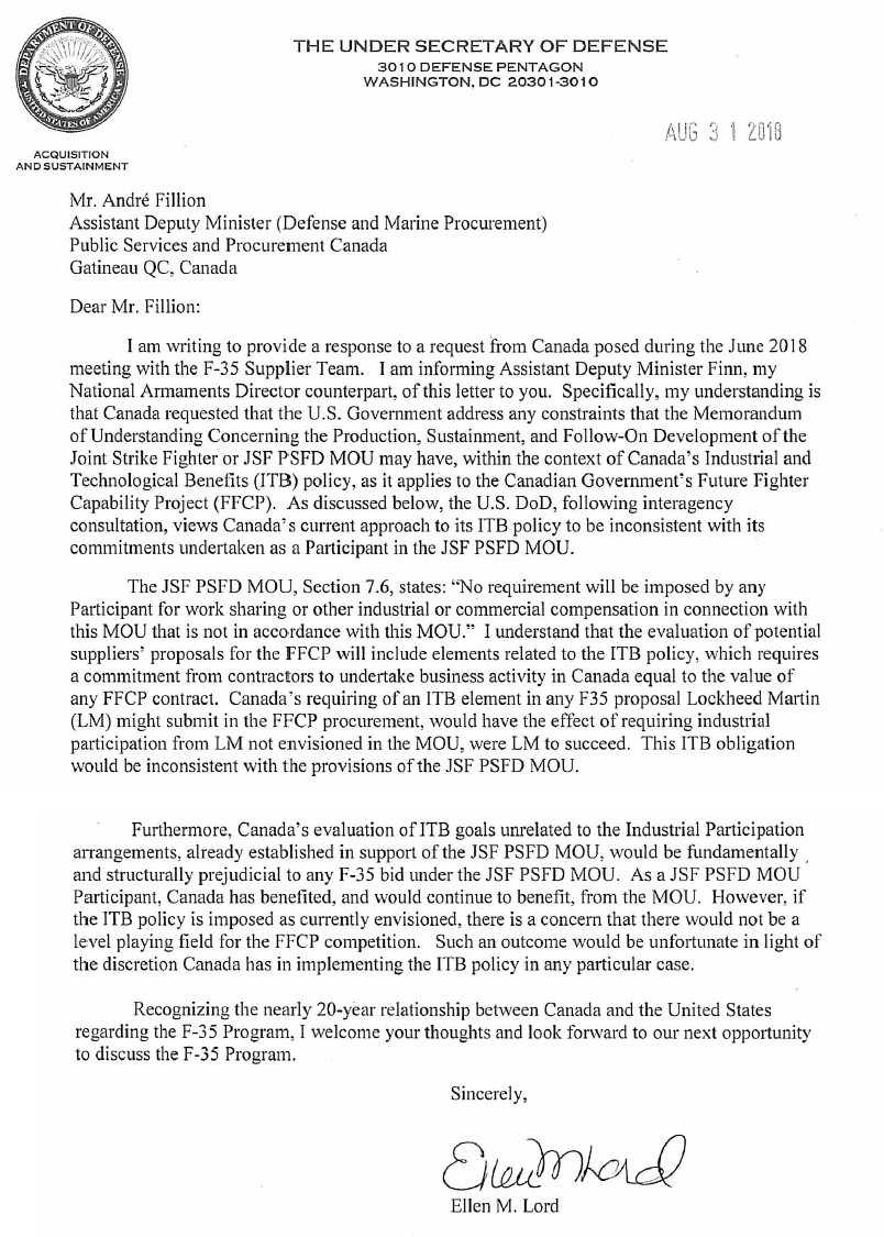 Ellen Lord, the U.S. Under Secretary of Defense for Acquisition and Sustainment, echoed the same sentiments in her own letter in August 2018. You can read that below, as well: