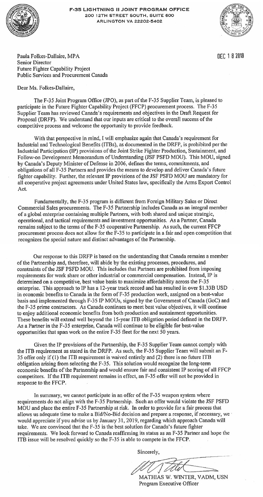 “The current FFCP procurement process does not allow for the F-35 to participate in a fair and open competition that recognizes the special nature and distinct advantages of the Partnership,” Winter wrote. Lord described Canada’s current plan as “fundamentally and structurally prejudicial to any F-35 bid.”