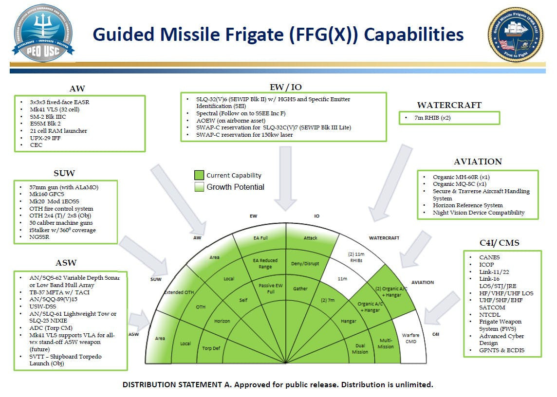 A crew of just over 150 can operate the frigate, fulfilling another Navy stipulation. The basic design has a big flight deck and associated hangar that could easily accommodate the MH-60R Sea Hawk helicopters and MQ-8C Fire Scout the service expects will fly from its FFG(X)s.