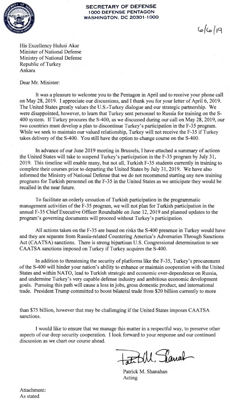 Acting Secretary of Defense Patrick Shanahan made the situation clear to his Turkish counterpart Hulusi Akar in a letter dated June 6, 2019, which multiple outlets subsequently obtained. Ellen Lord, the Undersecretary of Defense for Acquisitions and Sustainment, offered additional details in a press conference on June 7, 2019.