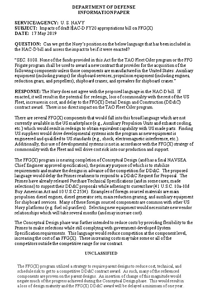 “The Navy does not agree with the proposed language in the HAC-D bill,” the service had told legislators just days ago in no uncertain terms. “An insertion of change of this magnitude would negate much of the progress achieved during the Conceptual Design phase. This would result in a loss of design maturity and the FFG(X) DD&C [Detail Design and Construction] award will be delayed by a minimum of one year.”