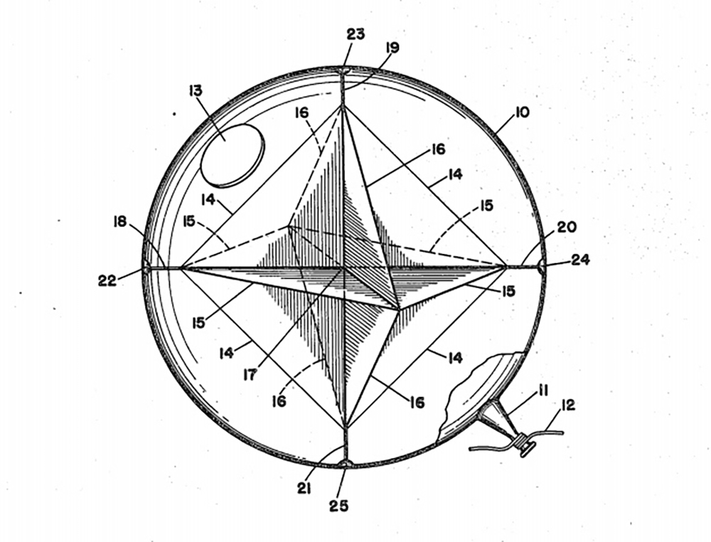 The elasticity of the supports and/or the reflector unit itself provides for the usual expansion of the ascending balloon. The unit does not cut off the balloon into isolated sections and accordingly it may be filled with gas through a single port. I prefer to seal the balloon after the reflector unit is secured in position. The seal may be a separate piece as illustrated, or may include the intake port. A typical balloon will be about six (6) feet in diameter, although a such [sic] smaller or larger one may be used. The points of the reflector surfaces are joined by rubber bands, as by spot vulcanization. The use of rubber bands or elastic reflector surfaces is to allow for the usual expansion of a rubber balloon as it attains great height with the resulting low atmospheric pressure…”