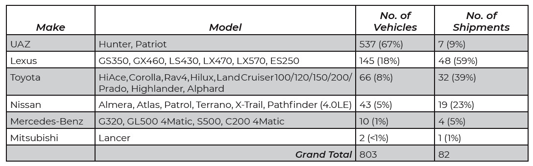 C4ADS’ investigation says that there are strong indications that these sort of realities helped North Korea, by way of its own front companies along with legitimate shipping and freight forwarding companies, import a total of 803 foreign-made cars, including luxury models, across 82 individual shipments between February 2016 and November 2017 alone. The vast majority of these vehicles were purchased in Russia, though actual Russian makes, such as 4×4 UAZ Patriot sport utility vehicles, made up less than 10 percent of the shipments.
