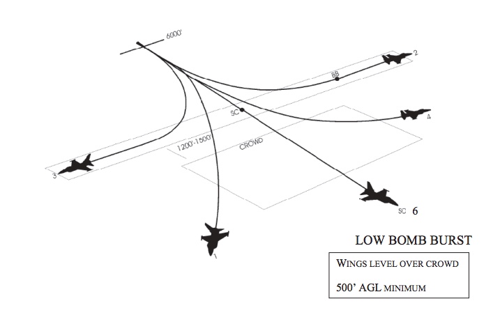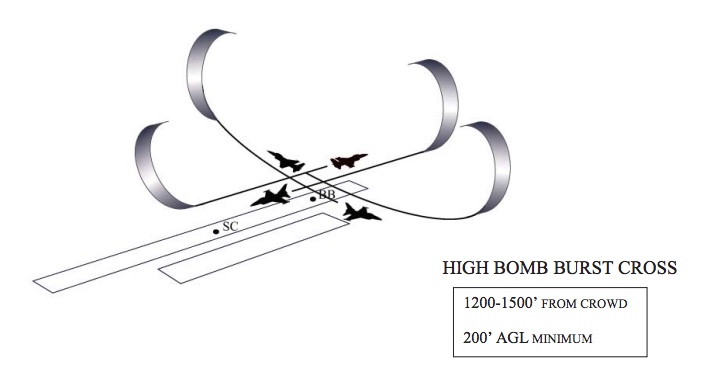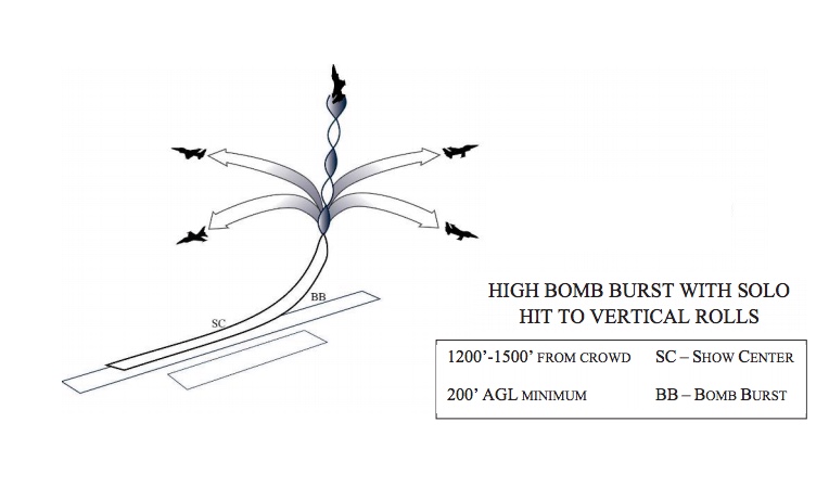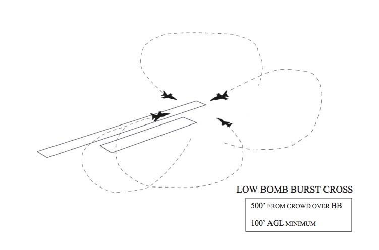 This second part of the Bomb Burst, the High Bomb Burst Cross, becomes the Low Bomb Burst Cross when cloud cover or other inclement weather keeps the team from doing their primary “high show,” with the “low show” being flown instead. During the low show, instead of breaking out in the vertical for the Bomb Burst, the jets do so in the horizontal. Again with four of the five jets returning to show center for the thrilling crossing maneuver.