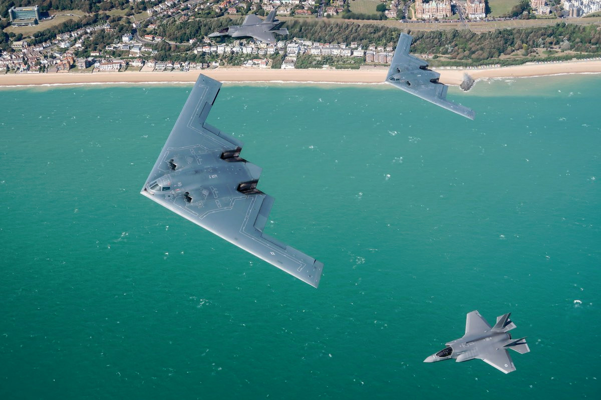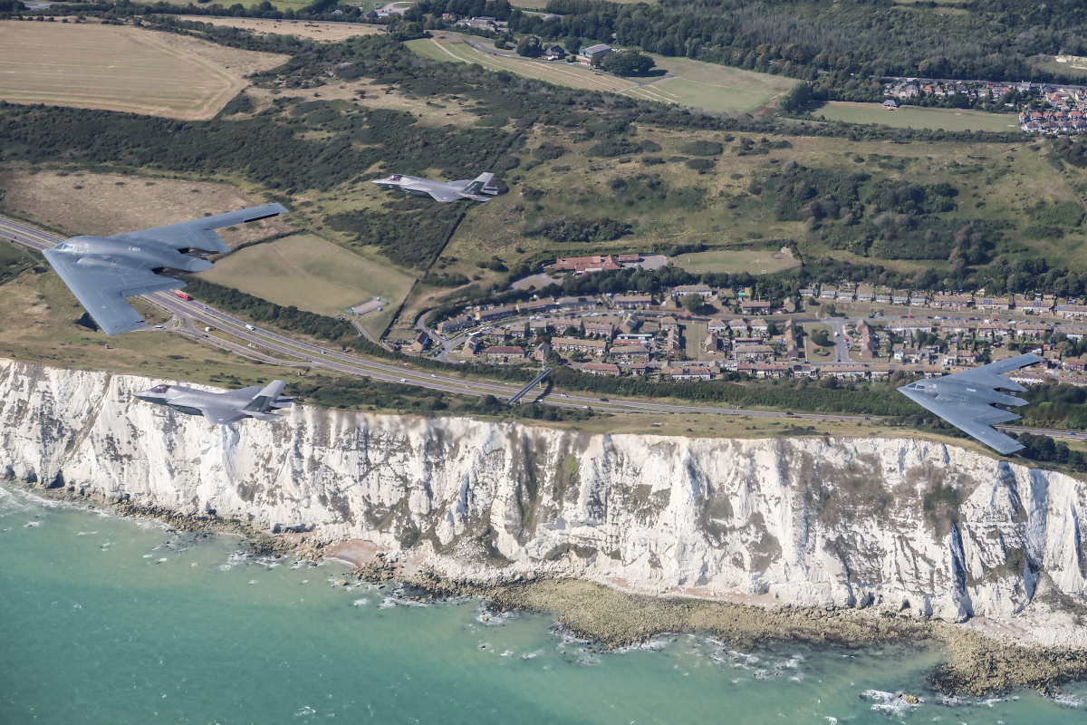 The integration training flight off the coast of Dover in the United Kingdom actually took place on Aug. 29, 2019, though the Royal Air Force and U.S. Air Forces in Europe only announced it today. In addition to this being the first time that RAF F-35Bs have flown with B-2s, it is also the first time the bombers have flown with any F-35s from a foreign air force. The three B-2s first arrived at RAF Fairford on Aug. 27, 2019.
