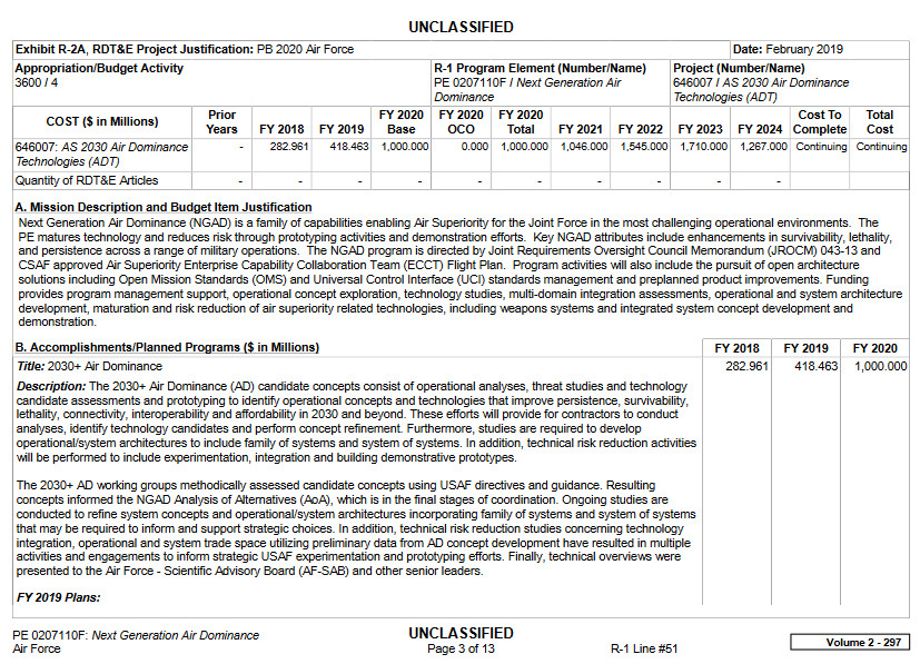 The Air Force’s latest budget request for 2020 Fiscal Year budget asks for more than $1 billion to conduct additional studies into both aircraft and weapon systems under NGAD. “The 2030+ Air Dominance candidate concepts consist of operational analyses, threat studies and technology candidate assessments and prototyping to identify operational concepts and technologies that improve persistence, survivability, lethality, connectivity, interoperability and affordability in 2030 and beyond,” the service’s budget documents say in outlining the plans for the upcoming fiscal cycle.