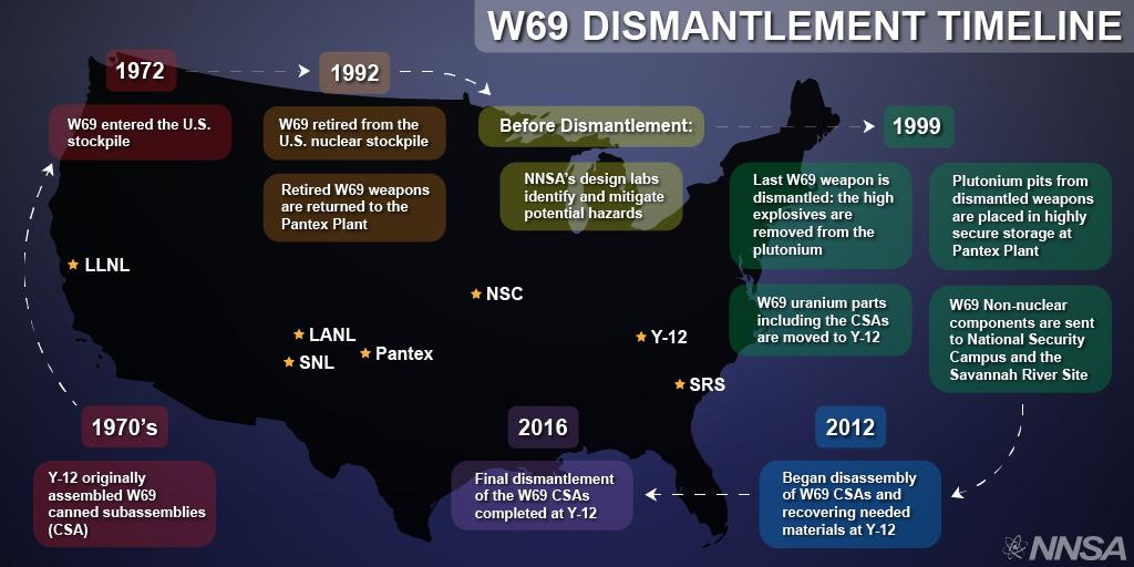 The United States began removing the weapons from its nuclear stockpile for good in 1992. The National Nuclear Security Administration (NNDA), part of the Department of Energy, completed an initial dismantlement process on all of the W69s by 1999, but did not finish completely dismantling their component parts until 2016.