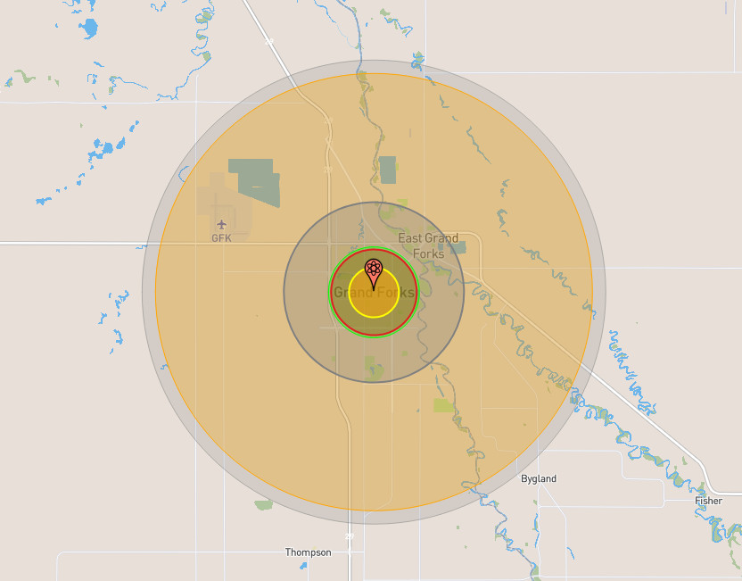 As many as 70,000 people living within 20 miles of Grand Forks could have been exposed to high doses of radiation. Depending on the exact circumstances and weather patterns, radioactive material may have been blown even further across communities to the southwest. The nuclear material would also have contaminated the ground and potentially gotten into water supplies causing further, long-term environmental impacts.