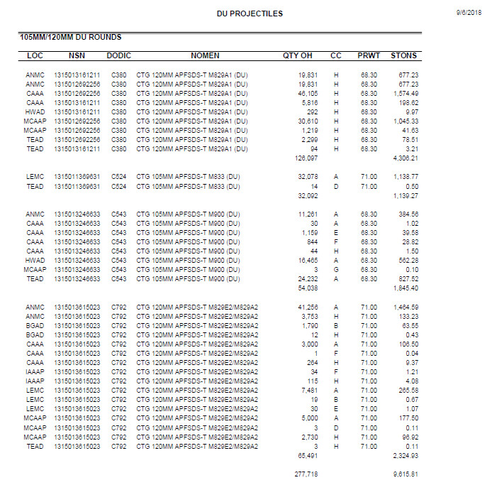 The Army has provided prospective contractors with a detailed list of the types of ammunition and the total number of rounds of each type that they could be called upon to break down. The final tally is 35,748,417 individual rounds of all types in storage at eight different Army facilities, the Anniston Munitions Center (ANMC), Blue Grass Army Depot (BGAD), Crane Army Ammunition Activity (CAAA), Iowa Army Ammunition Plant (IAAAP), Letterkenny Munitions Center (LEMC), Hawthorne Army Depot (HWAD), McAlester Army Ammunition Plant (MCAAP), and Tooele Army Depot (TEAD).