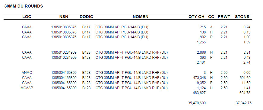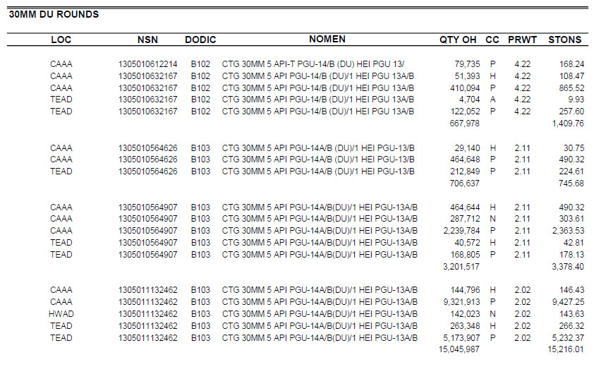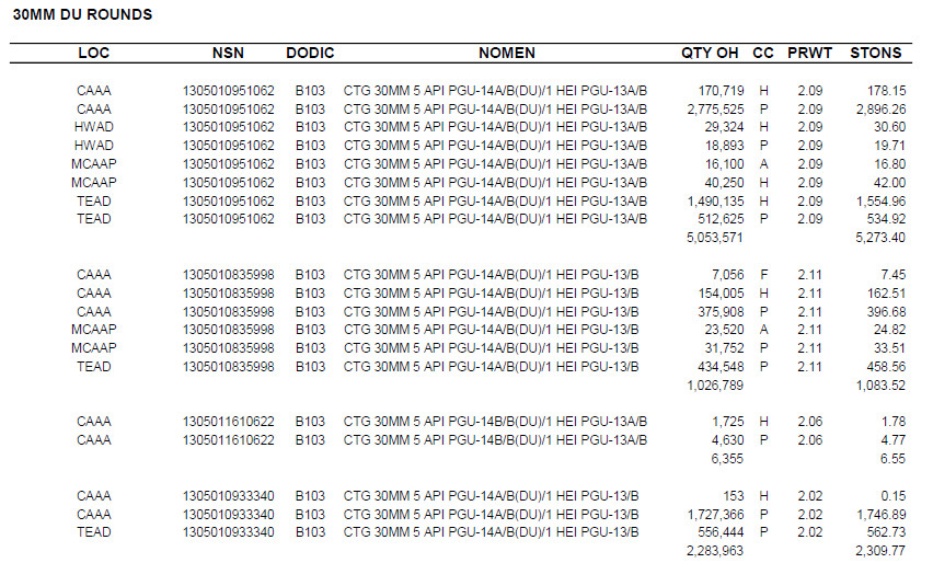 The remaining 35,470,699 are 30x173mm shells intended for the GAU-8/A. These include armor-piercing PGU-14/B, -14A/B, and -14B/B rounds with DU penetrators, as well as belts of ammunition interspersed with PGU-13/B and -A/B high-explosive incendiary shells that have no DU. One would imagine that the Army would seek to recover the HEI rounds for later use as the contracting notice says nothing about disposing of non-DU ammunition and the PGU-13/B family remains in U.S. military use across multiple platforms, including Air Force AC-130W and J model gunships. It’s unclear whether this represents the entire stockpile of PGU-14/B rounds left anywhere within the U.S. military.