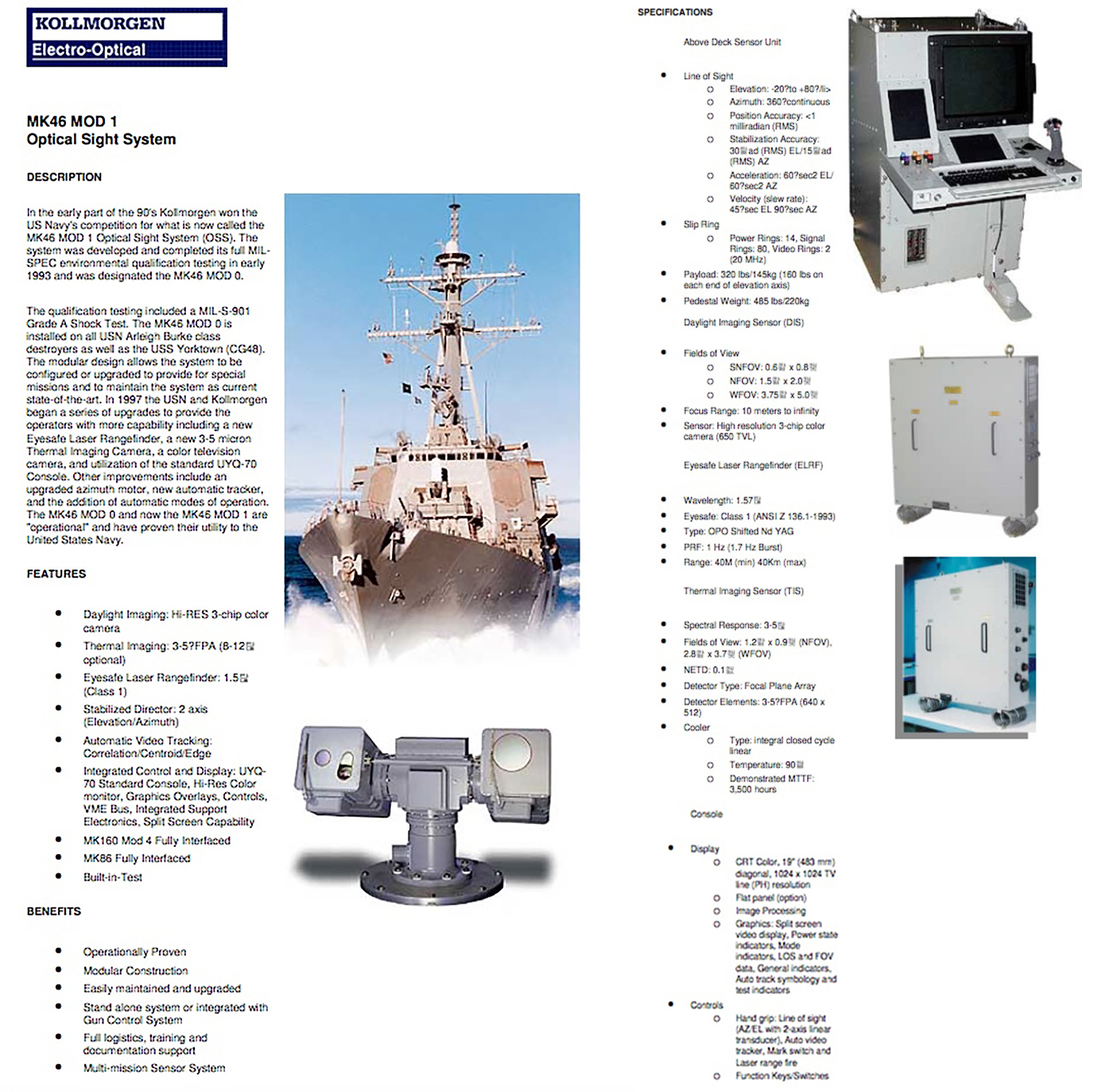 The Mk20 Mod 1 and the Electro-Optic Sighting Systems that precede it (Mk20 Mod0 and Mk46) include an “above deck” unit with visual and thermal imaging sensors, a laser range finder, stabilization system and shock isolation unit, and a “below deck unit” that contains the control, tracking, power supplies and interface to display and control stations.