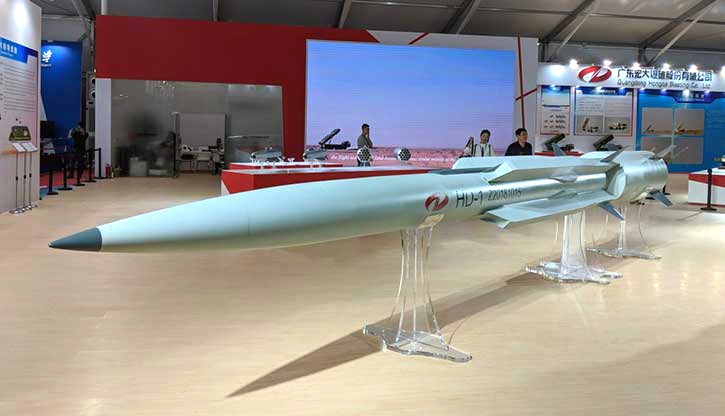 The main weapon has large strakes or fins and what appear to be a number of relatively long and thin fairings at the tail end, which some have suggested could be ramjet intakes. An air-breathing ramjet propulsion system would fit with the large booster motor, since the weapon would then need to get up to an appropriate speed and altitude before its engines could function properly. A number of existing Chinese supersonic anti-ship missiles, such as the YJ-12 series or the newer HD-1, use a similar general configuration.