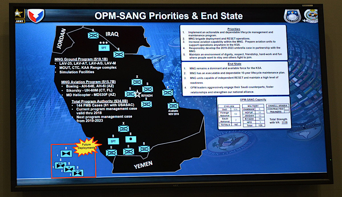 Training, in general, was also a problem. Muth said that he had initiated plans in 2016 to establish officer and non-commissioned officer academies to improve the performance of SANG’s leadership, but that it was unlikely they would produce results for at least five years. Bear in mind that OPM-SANG has been working in Saudi Arabia since 1973. In the interim, American advisors had helped craft a six-week “Warrior Leaders Course” to try and improve the force’s overall quality.