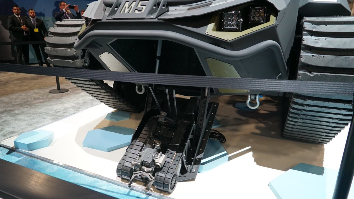 Howe and Howe and FLIR Systems also teamed up to enable the M5 demonstrator to deploy its own smaller unmanned aerial and ground vehicles. An R80D Skyraider small quadcopter type drone can take off from and land on top of the vehicle and this newest iteration of the Ripsaw features a built-in bay in the front hull with a fold-down ramp for a Small Unmanned Ground Vehicle (SUGV), which is typically used for explosive ordnance disposal and urban scouting missions.