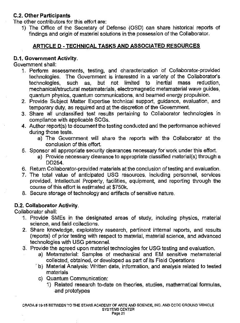“To the Stars Academy of Arts and Science is a company with materiel and technology innovations that offer capability advancements for Army ground vehicles,” this section of the CRADA says right up front. “These technology innovations have been acquired, designed, and produced by the Collaborator [TTSA], leveraging advancements in metamaterials and quantum physics to push performance gains.”