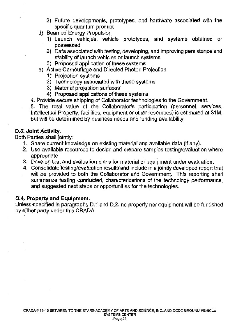 Not only that, but the CRADA specifically calls on TTSA to turn over research on quantum communication, directed photon projection system prototypes, as well as beamed energy propulsion “launch vehicles, vehicle prototypes, and systems obtained or possessed.” TTSA has released concept art in the past of a revolutionary flying vehicle, but there has been no indication that there are any actual prototypes or other related hardware of any kind.