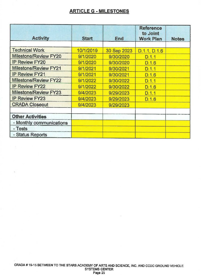 The CRADA says that the agreement will run Sept. 30, 2023, but that milestone and intelligence property reviews at the end of every fiscal year between now and then. The first of those reports are due by the end of September 2020.