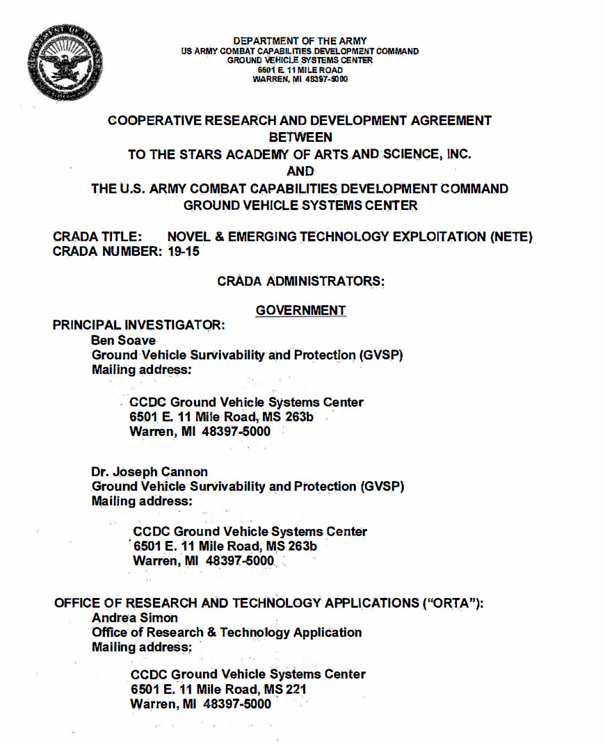 On Oct. 18, 2019, the GVSC released a copy of the 26-page formal CRADA document, titled “Novel & Emerging Technology Exploitation (NETE),” to us with some minor redactions to remove the contact phone numbers of the parties involved.