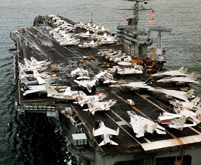 On Dec. 30, 1986, after a break for Christmas, the USS Nimitz entered the Western Atlantic with her bow pointed east toward the Strait of Gibraltar and entrance into the Mediterranean Sea. The squadrons of Carrier Air Group 8 (CAG-8, more commonly referred to as Carrier Air Wing Eight) which had been with the namesake of the Nimitz class of supercarrier since 1977, were already aboard having joined the carrier during the early days of December for the standard pre-deployment work-ups. The Nimitz flight deck and hangar bay was overflowing with a full complement of F-14 Tomcats from VF-84 Jolly Rogers and VF-41 Black Aces, A-7 Corsair II’s from VA-82 Marauders and VA-86 Sidewinders, A-6 Intruders from VA-35 Black Panthers, EA-6B Prowlers from VAQ-138 Yellow Jackets, E-2 Hawkeyes from VAW-124 Bear Aces, SH-3 Sea Kings from HS-9 Sea Griffins, and S-3A Vikings from VS-24 Scouts.