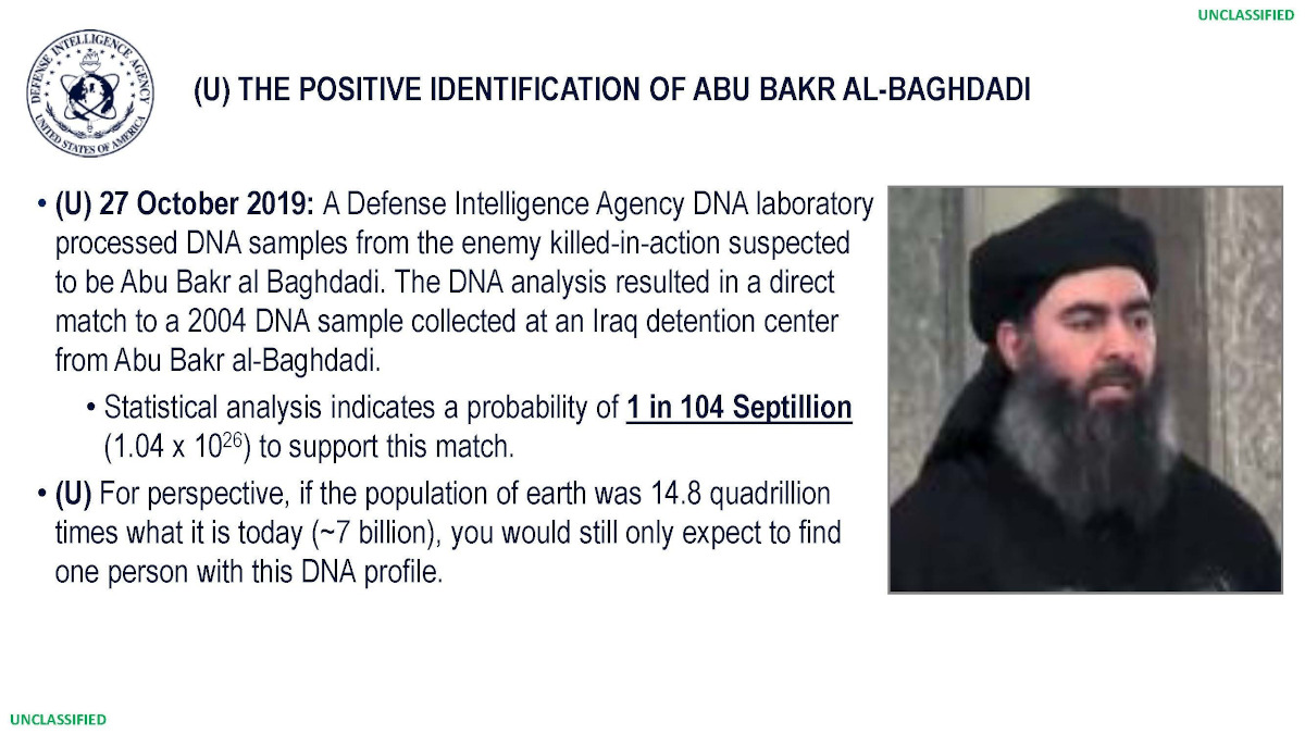- There is only a 1 in 104 septillion chance that the DNA is not from Baghdadi.