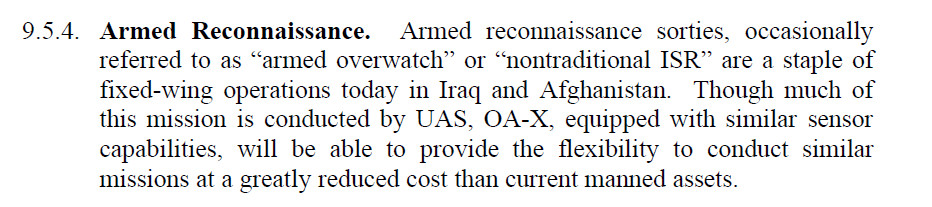 If it seems like an obvious role for these planes to an outside observer, it certainly is to the Air Force itself. The OA-X Enabling Concept, which personnel at Air Combat Command drafted in 2008 and is treated as a foundational text for the service’s more recent light attack programs, specifically mentions armed overwatch as a potential mission for this type of aircraft.