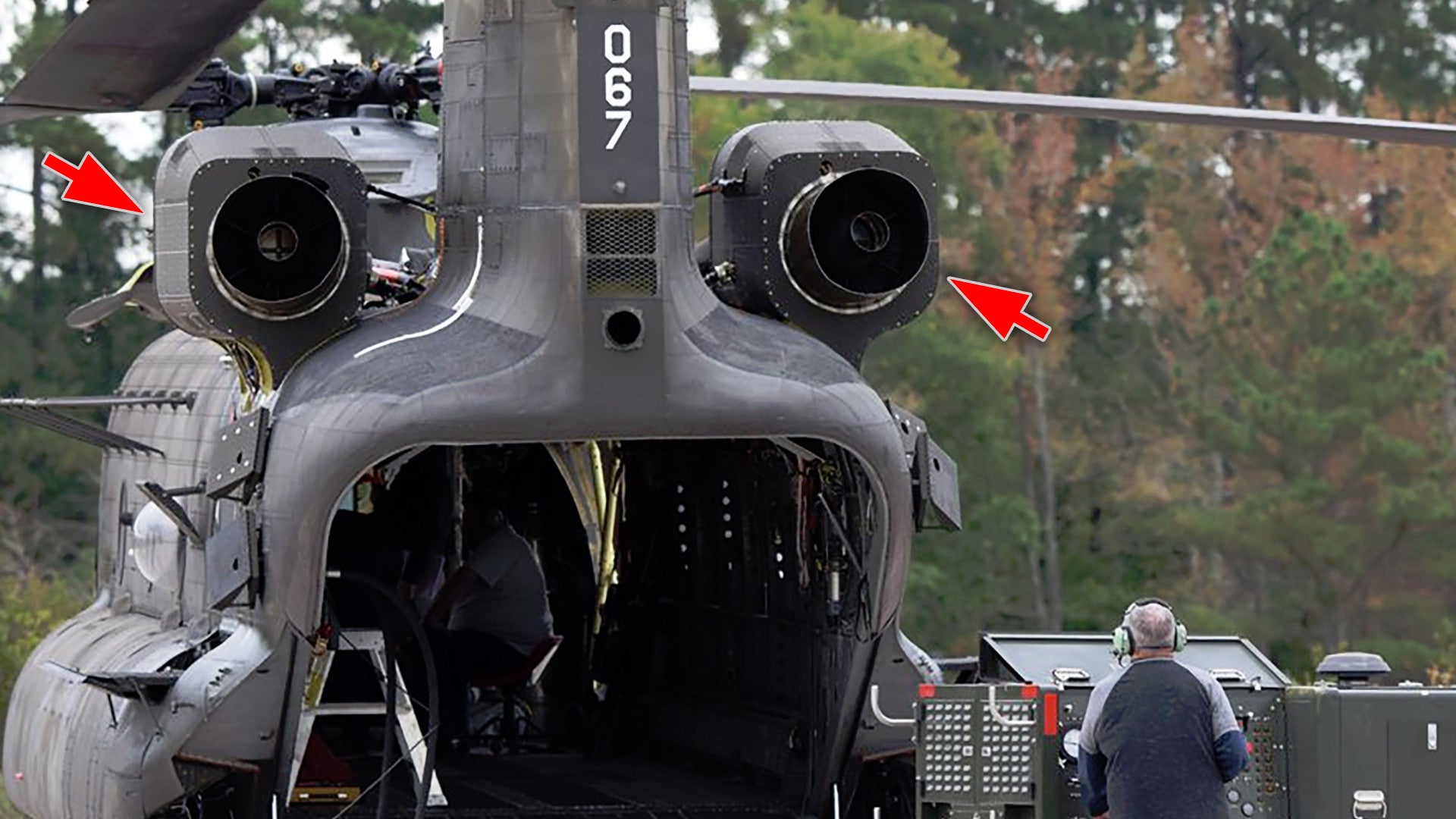 The picture does show that the T408s use entirely new nacelles with a more square shape, as compared to the circular ones associated with the Honeywell Aerospace T55s found on existing Chinooks. The nacelles also feature reinforcement bars between them and the helicopter’s fuselage.