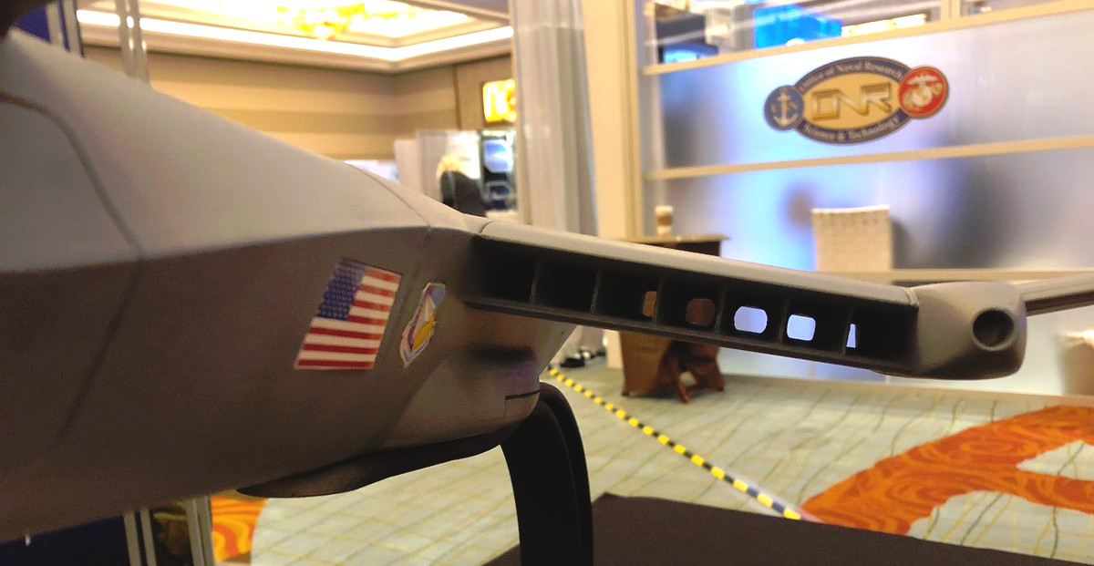 It’s not clear whether the model that AFRL displayed reflect the proposed short takeoff and landing capable “vision vehicle” in any way. There are markings painted on top of the central wing boxes that could indicate doors for ducting for a blown air system that could provide important extra lift. There are also indicators of large flaps on both the leading and trailing edges of the wing boxes that could generate even more lift.