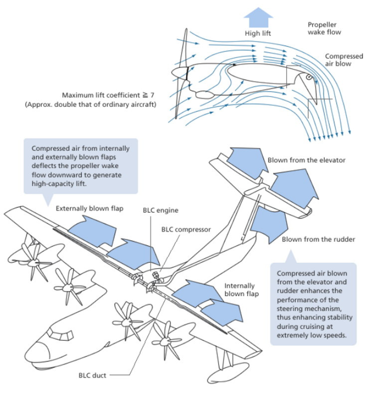 The main wings feature broad central “boxes” with sponsons in between them and more slender, swept outer sections. The two wing boxes on either side of the fuselage each contain seven separate sections where electric-powered fans would go.