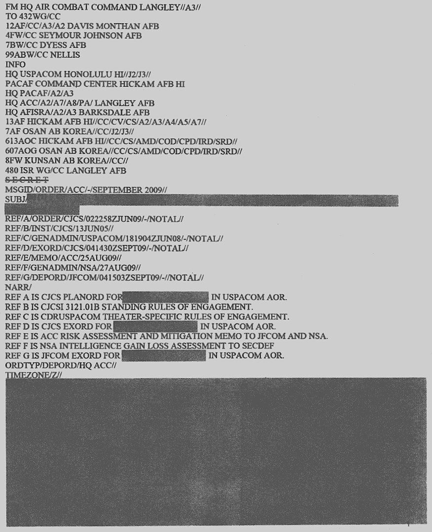 Much about the deployment still remains classified, despite the passage of time and even the prior official release of some information. For instance, Air Force censors removed any specific mention of the RQ-170 whatsoever, including in the subject line, from the official Air Combat Command deployment order, dated Sept. 4, 2009, despite having publicly released the title of that document seven years ago. We know that this is the document in question, because we requested it by name and the Air Force acknowledged that it was among the records it released to us with redactions.