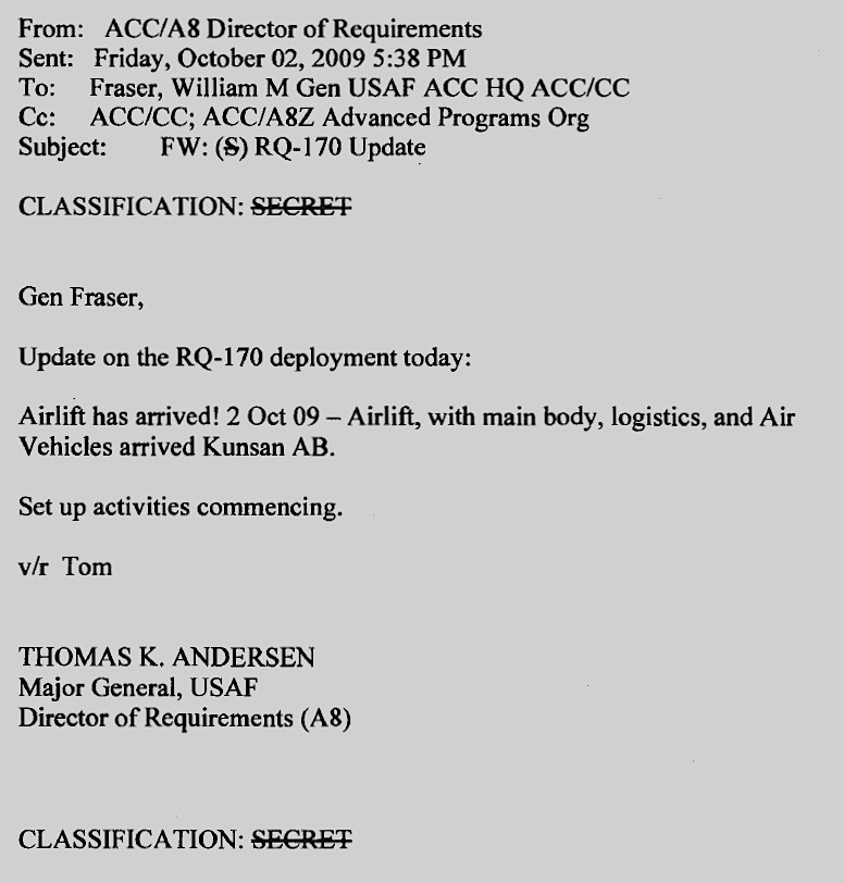 Whatever the findings of the risk assessments in 2009 were in the end, Joint Forces Command ultimately ordered the deployment of the RQ-170s to Kunsan in South Korea on Sept. 4 of that year. “Airlift has arrived!” Major General Thomas Andersen, then Director of Requirements for Air Combat Command, wrote in an Email to then-Major General William Fraser, who was head of Air Combat Command at the time, on Oct. 2.