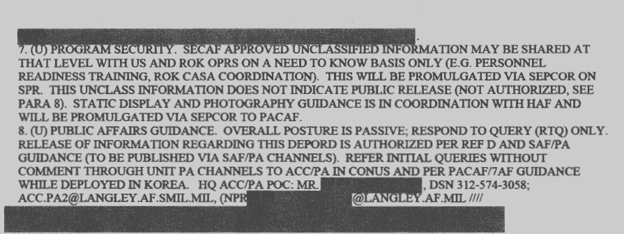 We do know that the National Security Agency (NSA), as well as Air Combat Command itself, did produce risk assessments regarding the proposed missions in East Asia after Chairman of the Joint Chiefs of Staff’s office issued the planning order. The Air Force completely redacted or otherwise withheld details about these reviews – including a memorandum from then-Major General David Goldfein, who was Air Combat Command’s Director of Air and Space Operations at the time – and a “special operational airworthiness release” for the RQ-170.