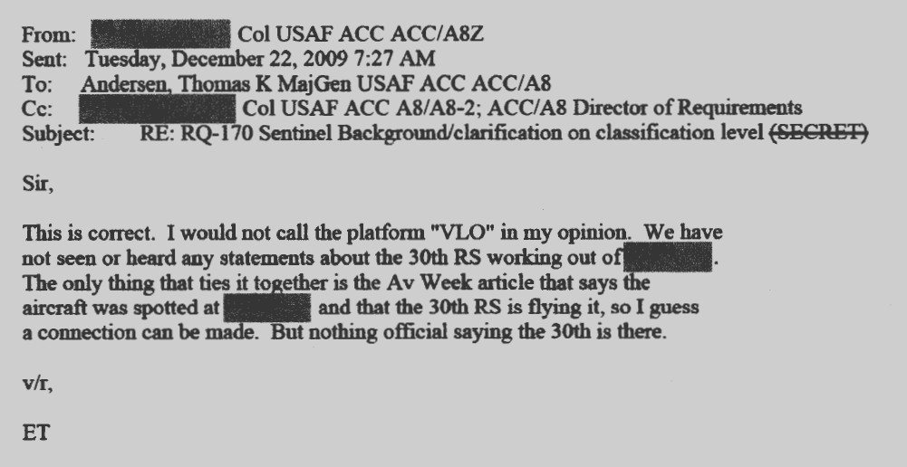 It’s also interesting to note that an Email string from December 2009, regarding what was and wasn’t classified about the RQ-170 program following its official disclosure, which The War Zone also received as part of the recent release of documents, includes a message from an unnamed colonel in Air Combat Command’s Advanced Concepts Branch (A8Z) stating that the drone is not actually “very low observable,” or VLO, despite earlier comments from other individuals within the command about the unmanned aircraft’s stealthy qualities. This same Email also mentions Aviation Week‘s contemporary reporting on the Sentinels.