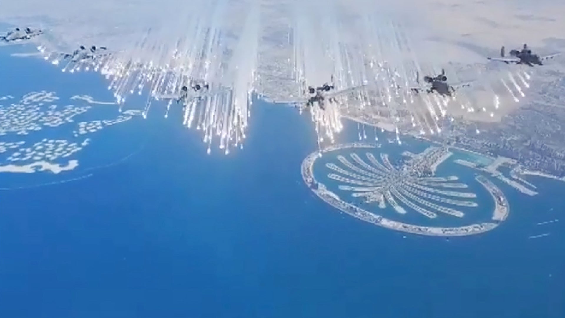 Mass flare releases by a single aircraft can be major crowd-pleasers, but six A-10 Warthogs flying in formation behind a tanker raining flares in unison is downright glorious. Just such a spectacle occurred near Dubai’s famed Palm and World man-made island archipelagos.