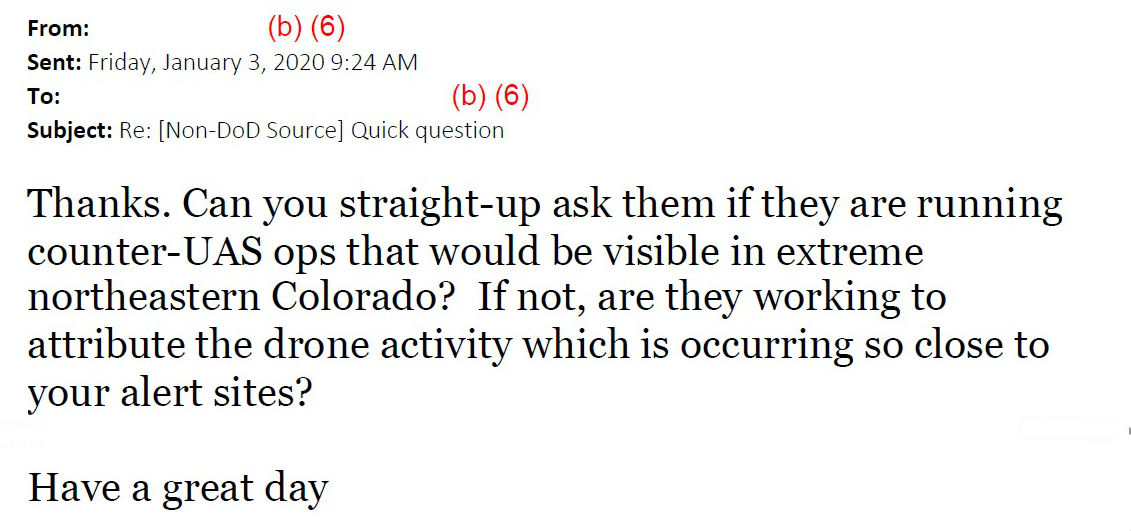In the F.E. Warren public affairs release, an email cited above dated Jan. 2, 2020 with a timestamp of 1:42 PM and the subject line “[Non-DoD Source] Quick question”, the author asks “Do you know if security forces is playing with UASs up there?”