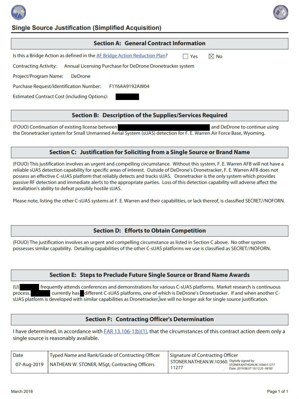However, the Single Source Justification documents for the contract notes that F.E. Warren uses an undisclosed number of other counter-sUAS systems and that “listing the other C-sUAS systems at F. E. Warren and their capabilities, or lack thereof, is classified SECRET//NOFORN.” The document adds that “no other system possesses similar capability” as the Dedrone system.