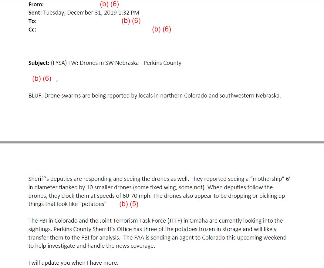 In one of the stranger exchanges found in the 90th Security Forces Group release, a participant in the email chain writes that some eyewitness reports state that the drones were dropping what appeared to be “potatoes” and that the Perkins County Sheriff’s Office collected some of them for analysis: