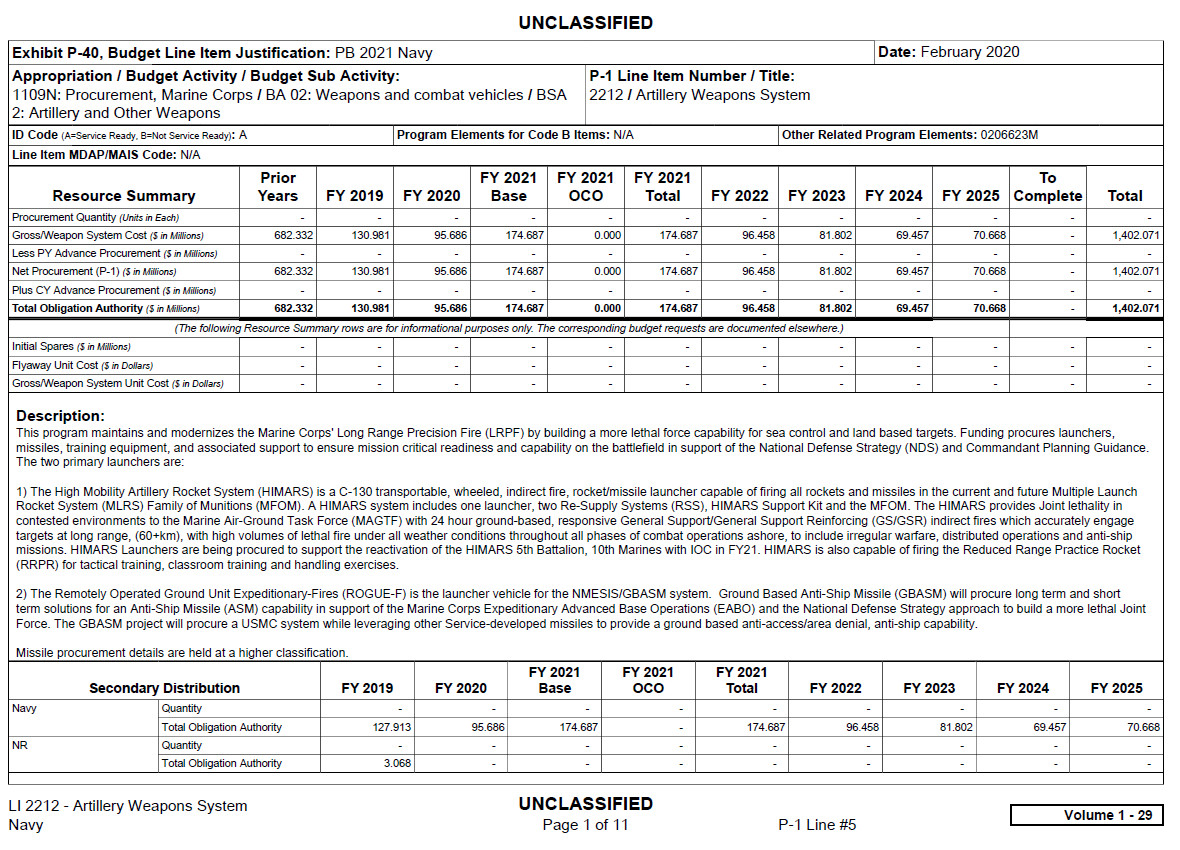 Separately in his testimony before Congress, Commandant Berger said that the Marines planned to integrate a ground-launched version of the smaller, shorter-range Naval Strike Missile (NSM) anti-ship cruise missile onto a derivative of HIMARS called the Remotely Operated Ground Unit Expeditionary-Fires (ROGUE-F). The present concept for ROGUE-F consists of a HIMARS launcher mounted on an unmanned chassis derived from the 4×4 Joint Light Tactical Vehicle (JLTV) tactical truck.