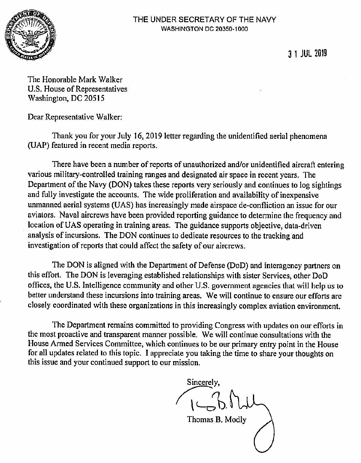 “There have been a number of reports of unauthorized and/or unidentified aircraft entering various military-controlled training ranges and designated air space in recent years,” Modly wrote in this July 31 response. “The Department of the Navy (DON) takes these reports very seriously and continues to log sightings and fully investigate the accounts.”