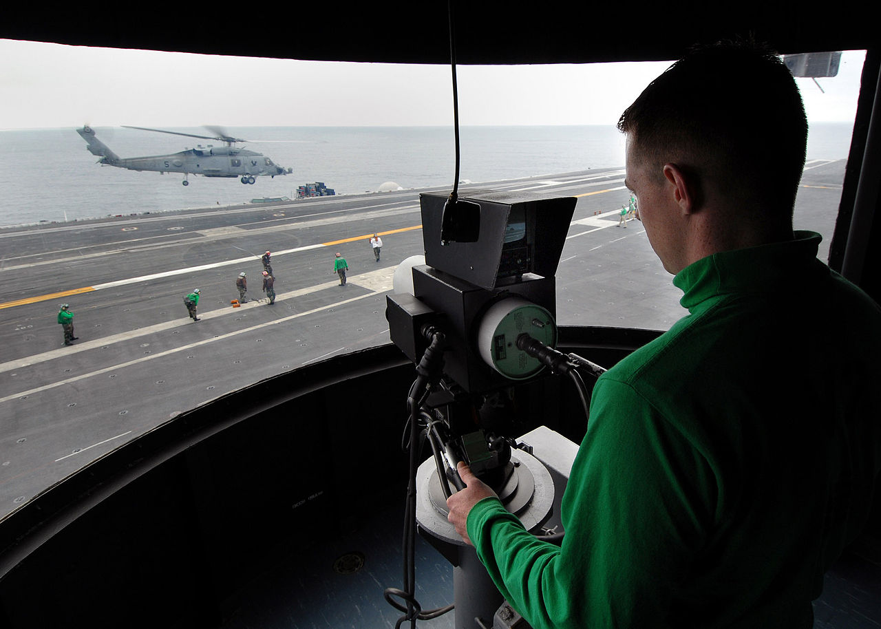 The Island Camera Room has served an essential role aboard U.S. aircraft carriers over decades. Inside, a sailor mans a television studio-like camera that has the ability to pan across the entire flight deck, sweeping a radial arch that is mirrored by the glass surrounding them.